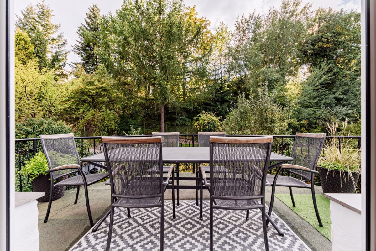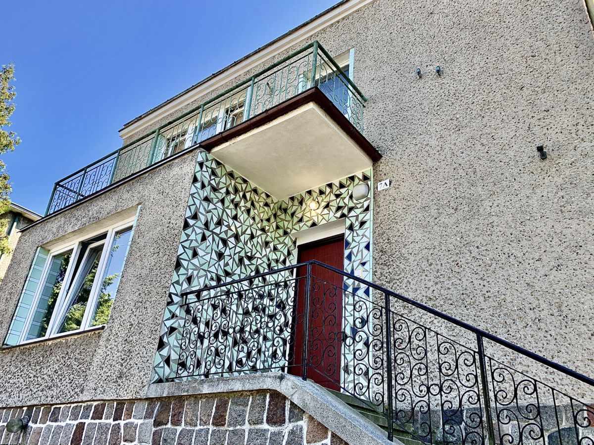 Układ: dwa oddzielne mieszkania - każde z osobnym wejściem i dostępem do ogrodu lub tarasu. Piękny, stary ogród z bujną roślinnością, w tym dużymi drzewami i zadbanymi krzewami. Duży taras na piętrze z widokiem na zieleń - idealny na rodzinne śniadania i wieczorne spotkania. Drewniany parkiet, duże okna i naturalne światło wewnątrz pomieszczeń.