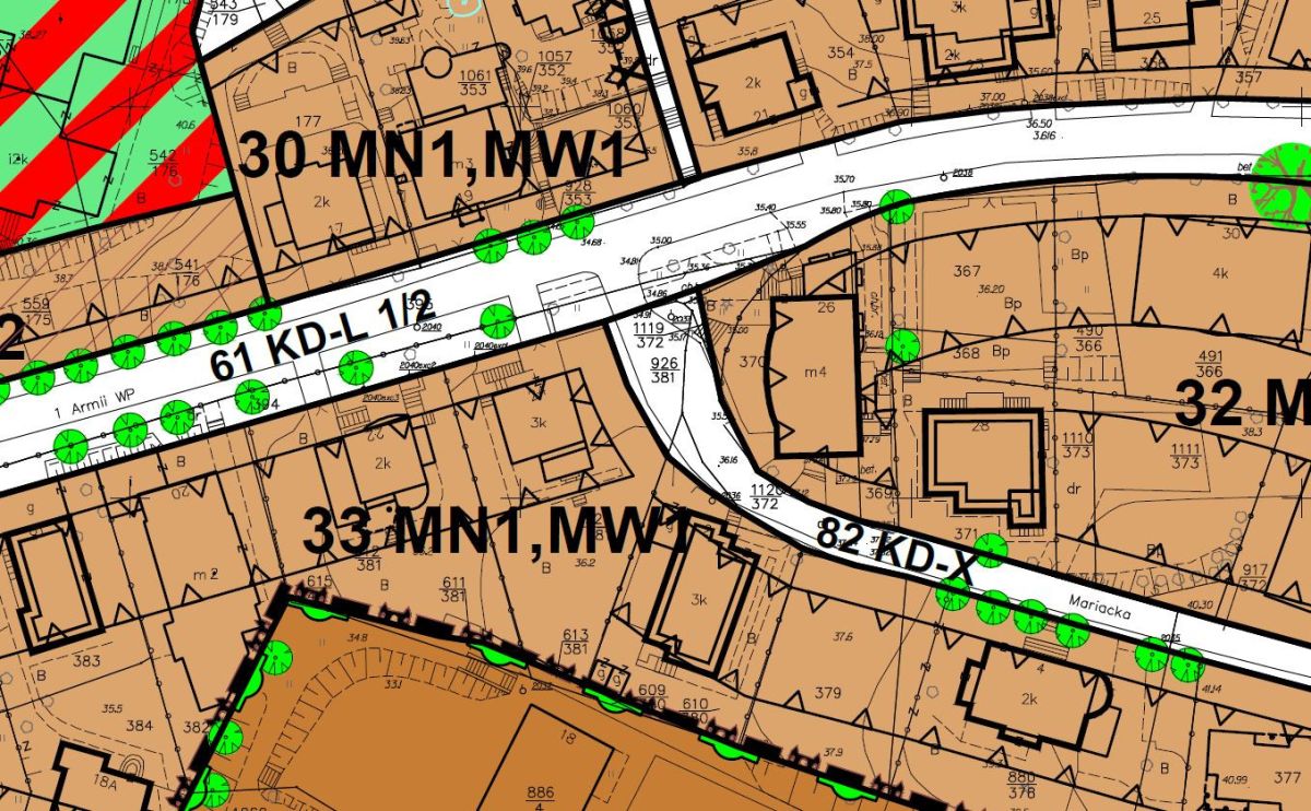- teren oznaczony jako 33 MN1, MW1 - zabudowa jednorodzinna wolnostojąca, zabudowa wielorodzinna - budynki zawierające do 4 mieszkań.