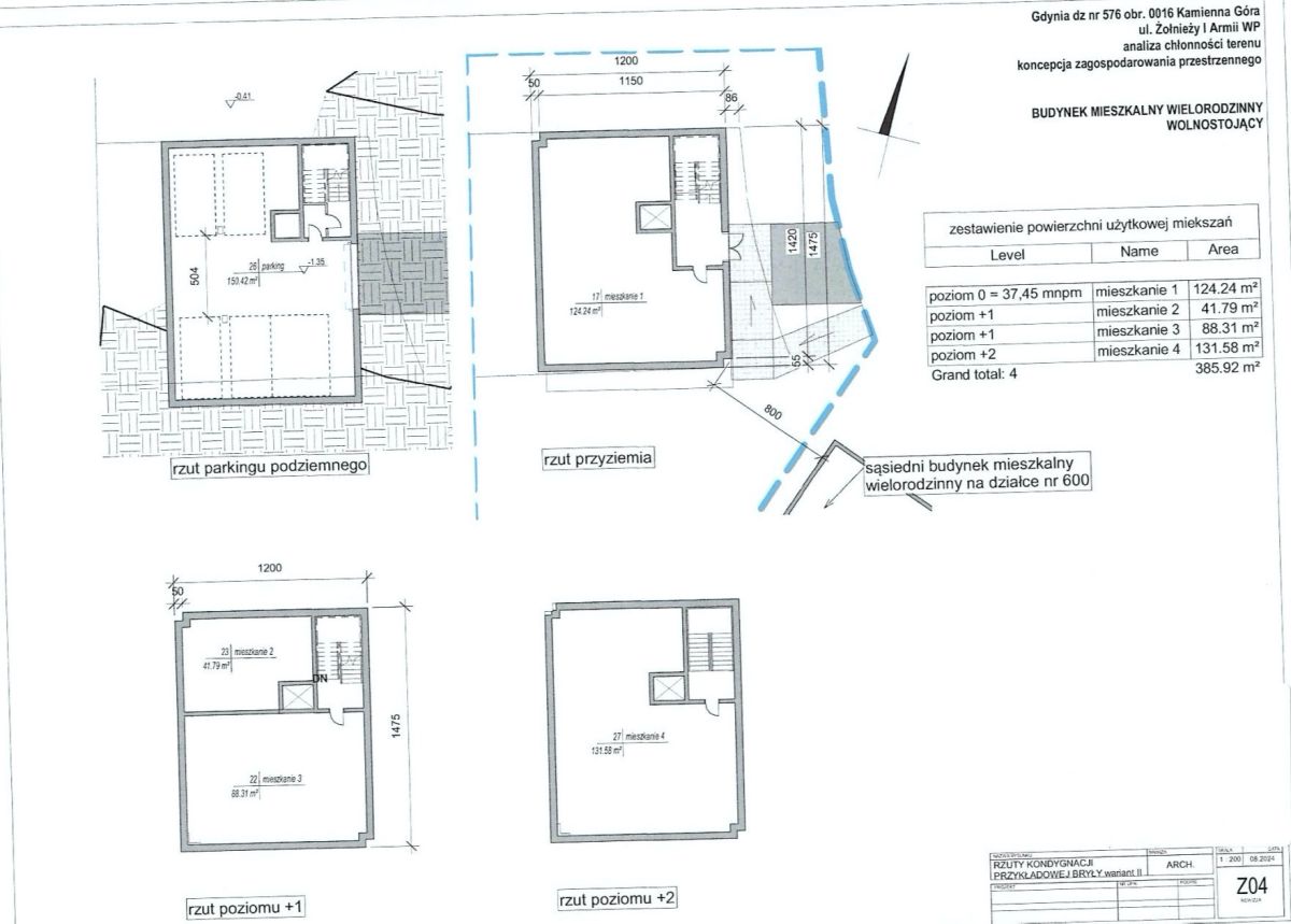 Zgodnie z powyższymi założeniami wykonano koncepcję zabudowy działki budynkim wielorodzinnym, 4 mieszkaniowym o pow. całkowitej naziemnej 529 m2 i pow. PUM 386 m2. (szczegółowe dane dostępne w formie elektronicznej u agenta). Do oferty załączono zdjęcie z koncepcji pokazujące rzuty projektowanych mieszkań: parter mieszkanie o powierzchni 124 m2 z ogrodem, I piętro: mieszkanie o powierzchni 42 m2 oraz mieszkanie o powierzchni 88 m2, II piętro: penthouse o powierzchni 131 m2 z dużym tarasem. Uwaga: powyższe założenia to tylko koncepcja architektoniczna - w razie chęci kontynuowania projektu należy ja uzgodnić z UM Gdyni.