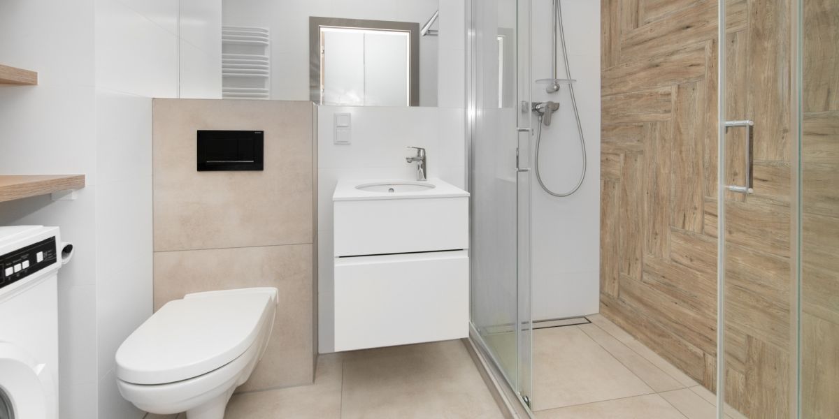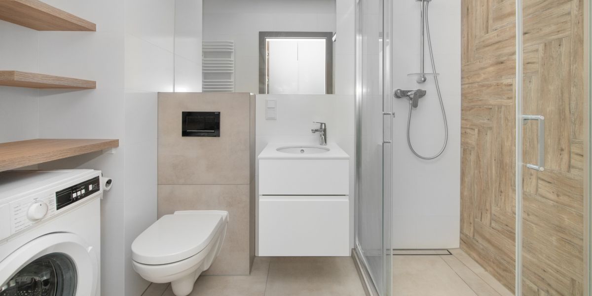 Funkcjonalna łazienka z kabiną prysznicową i nową pralką,