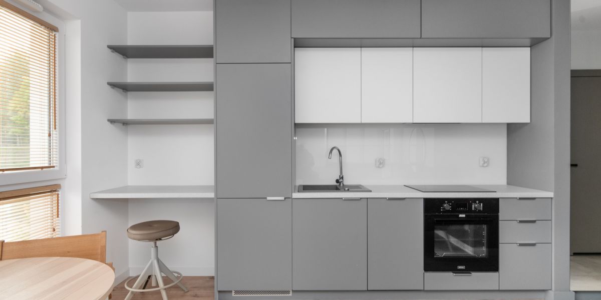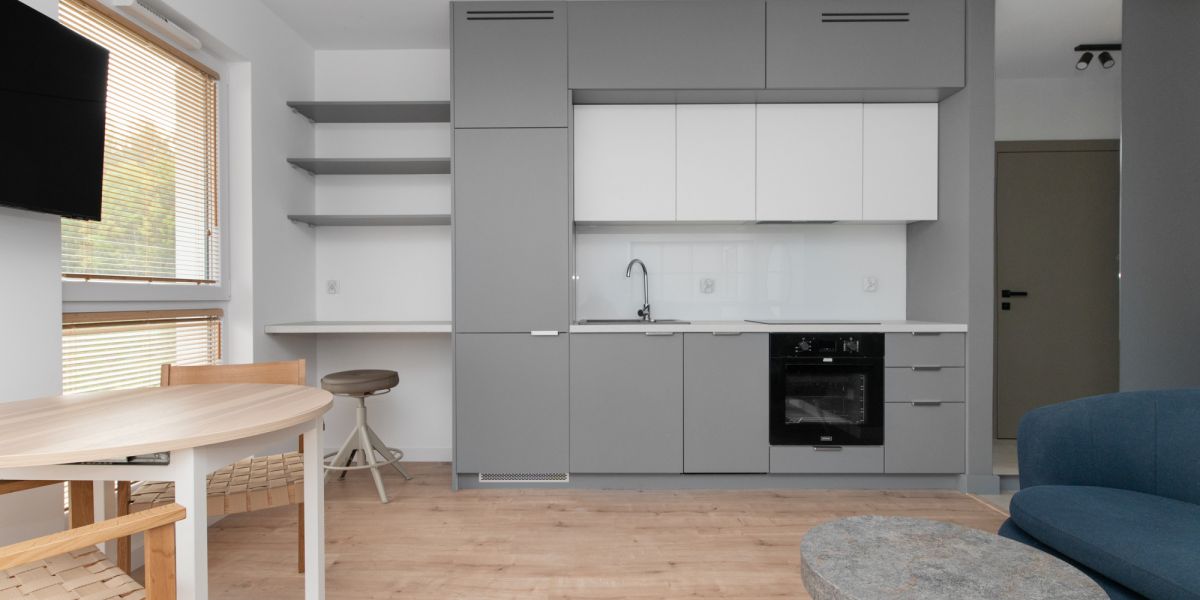 Nowoczesny aneks kuchenny wyposażony w: zmywarkę, piekarnik, płytę indukcyjną, lodówkę z zamrażarką w zabudowie,