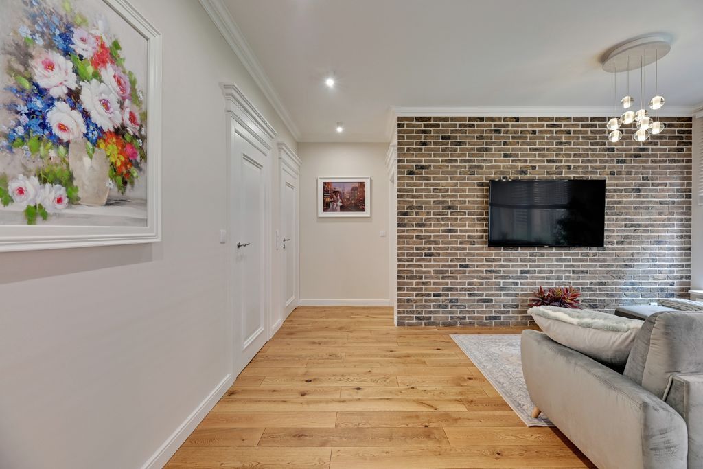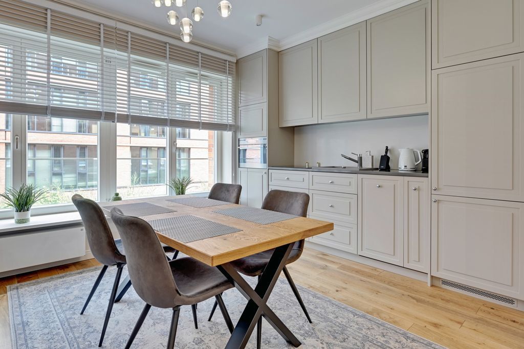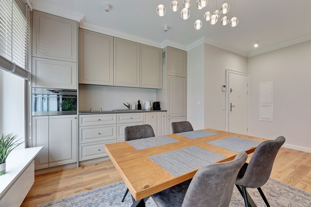 Mieszkanie zostało wykończone z dbałością o detale, przy użyciu materiałów wysokiej klasy. Meble wykonane na zamówienie podkreślają elegancki charakter wnętrza. Kuchnia jest w pełni wyposażona w niezbędny sprzęt AGD, w tym zmywarkę, piekarnik, płytę indukcyjną oraz lodówkę. Lokal jest gotowy do zamieszkania od zaraz.