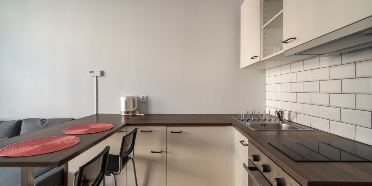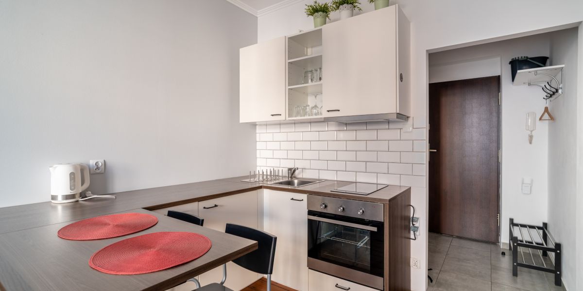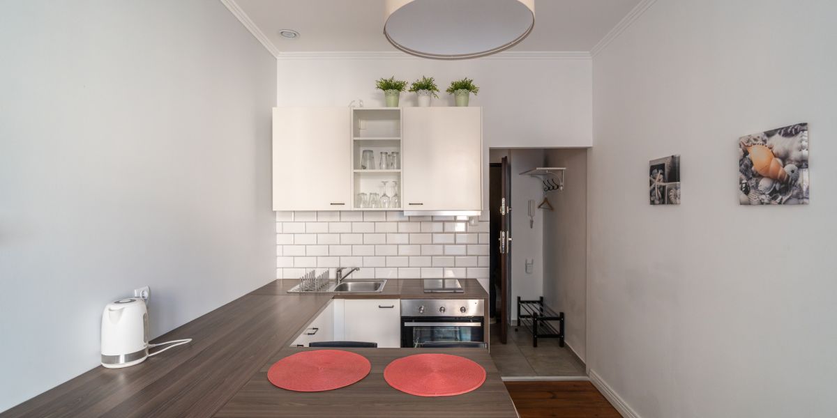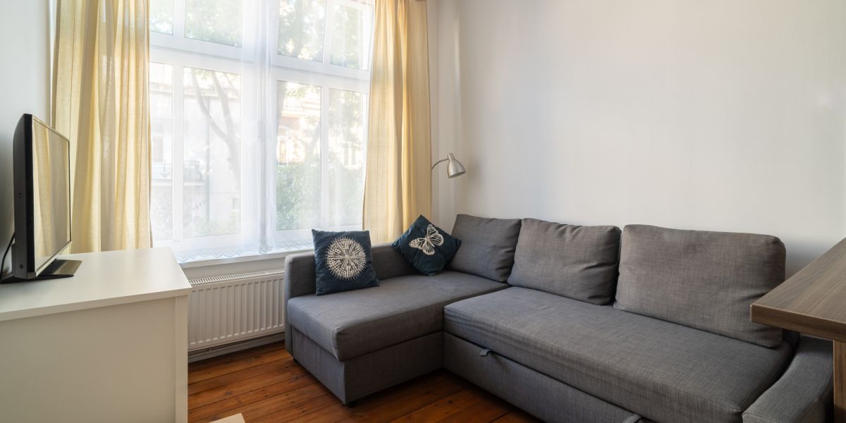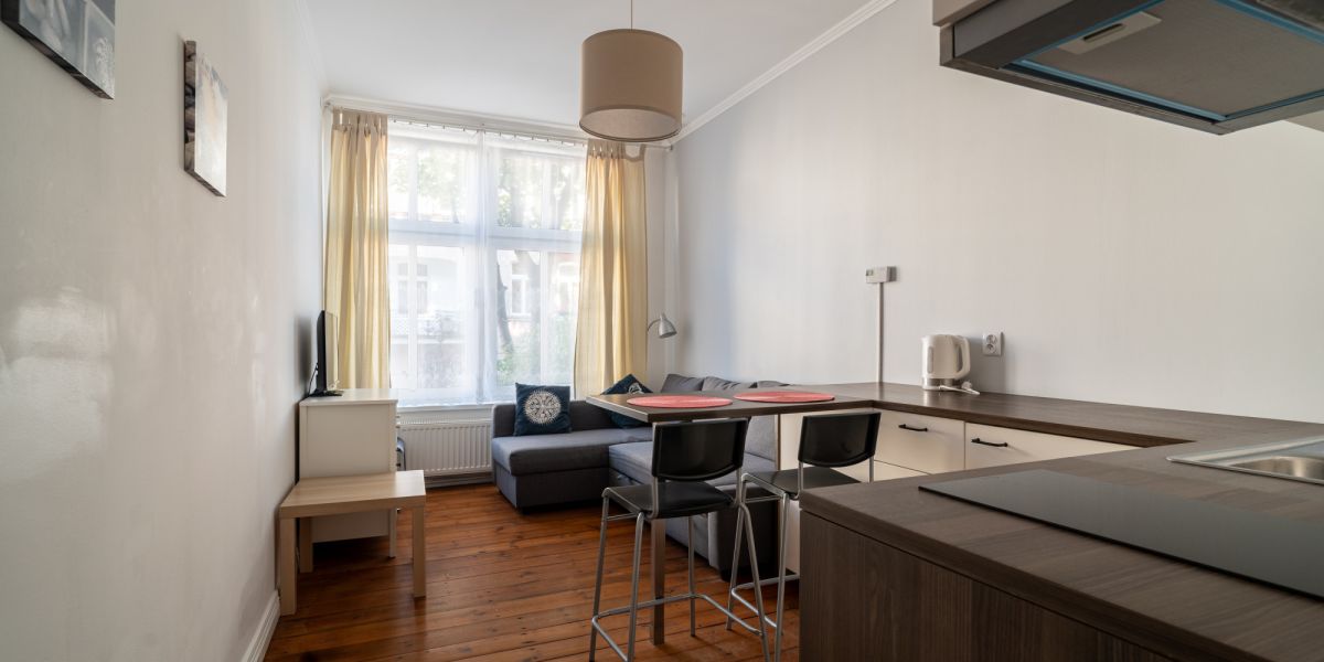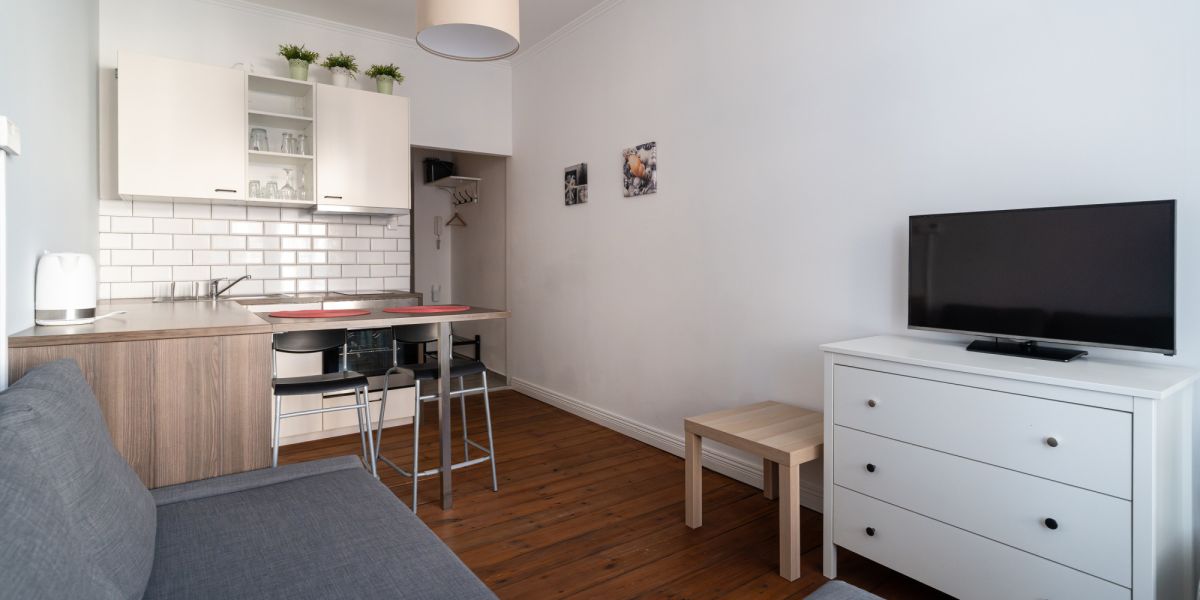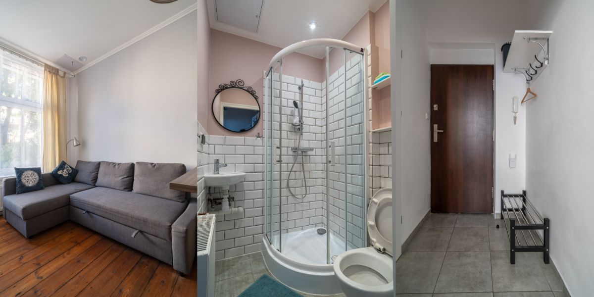 Wysoki parter - małe studio na wynajem długoterminowy. Salonik z rozkładaną kanapą, aneks kuchenny w pełni wyposażony, hol i łazienka z kabiną prysznicową. Duże okna wystawą zapewniają odpowiednią ilość światła przez cały dzień.