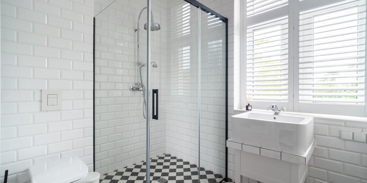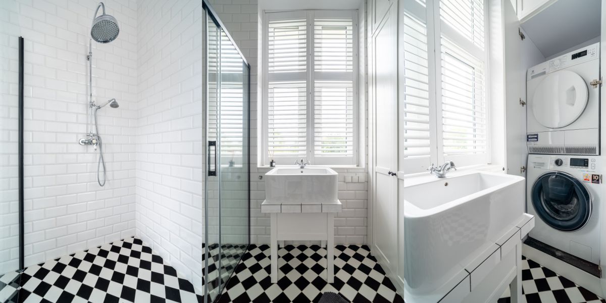 Zachwycająca łazienka z przeszkloną kabiną prysznicową z deszczownicą, dużym lustrem, retro armaturą oraz praktycznym zestawem pralka + suszarka w zabudowie. Jasne wnętrze z dużym oknem i shuttersami.