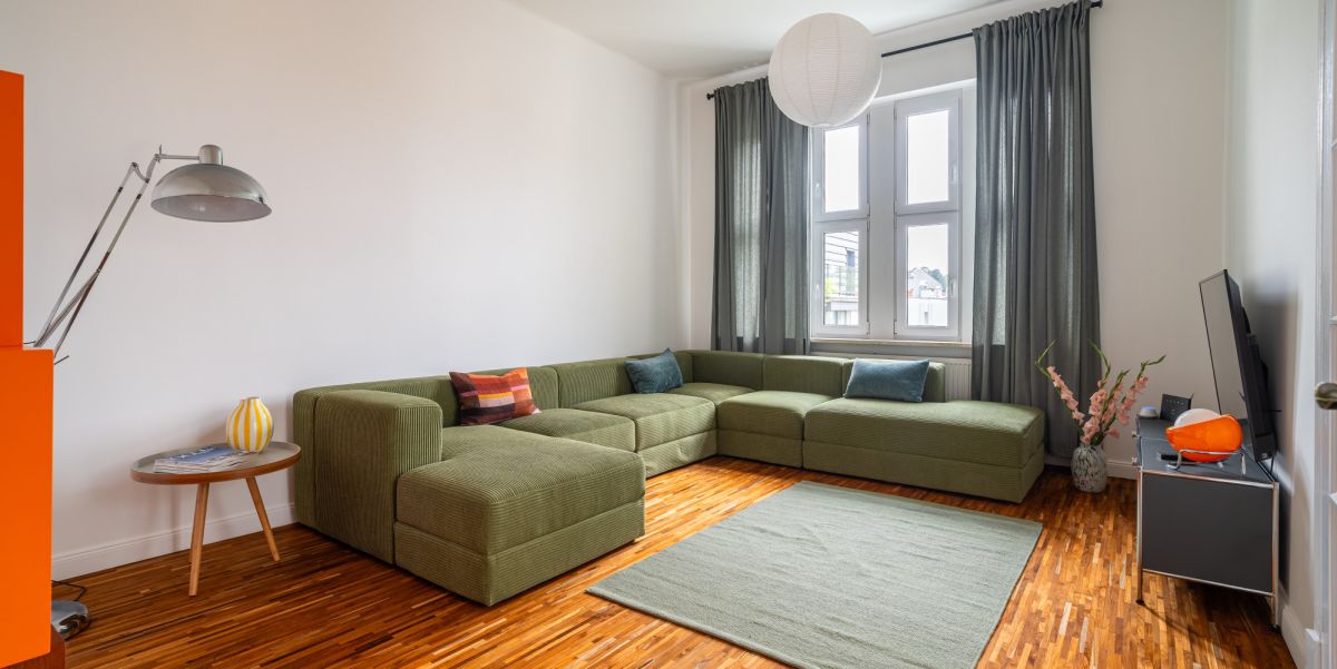 Salon z częścią wypoczynkową. Przestronny i jasny salon z dużym narożnikiem z oliwkowej tkaniny sztruksowej, designerskimi dodatkami, lampą podłogową i telewizorem. Wyjątkową atmosferę tworzą wysokie okna z oryginalnymi zasłonami oraz drewniana egzotyczna podłoga.