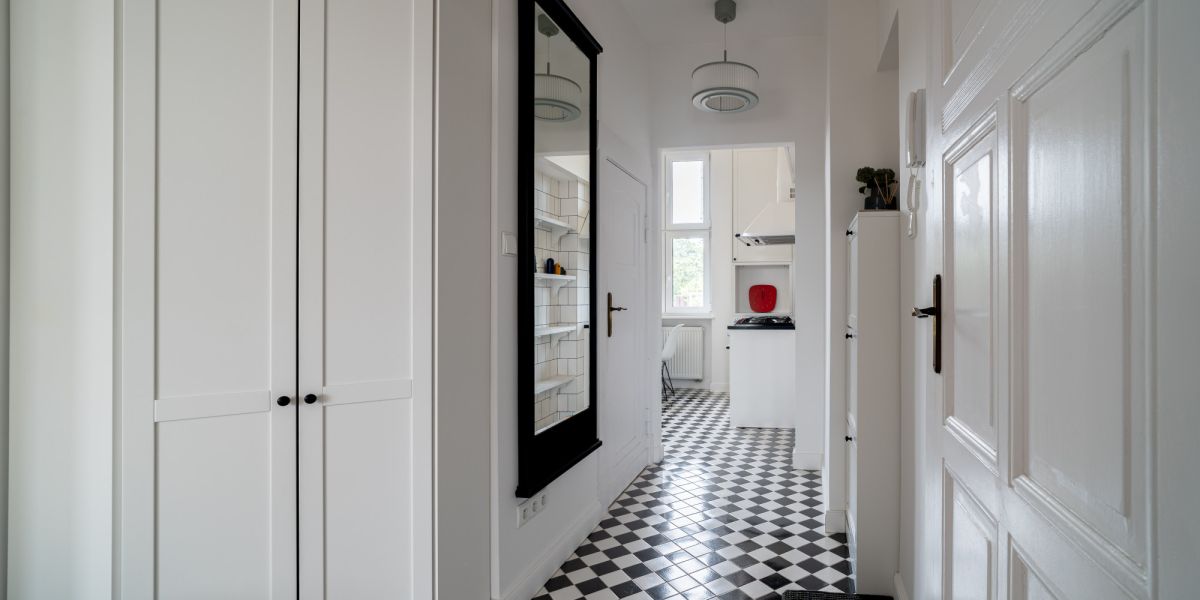 Zabudowana szafa, duże lustro w czarnej ramie, stylowa podłoga w szachownicę, neutralne kolory.