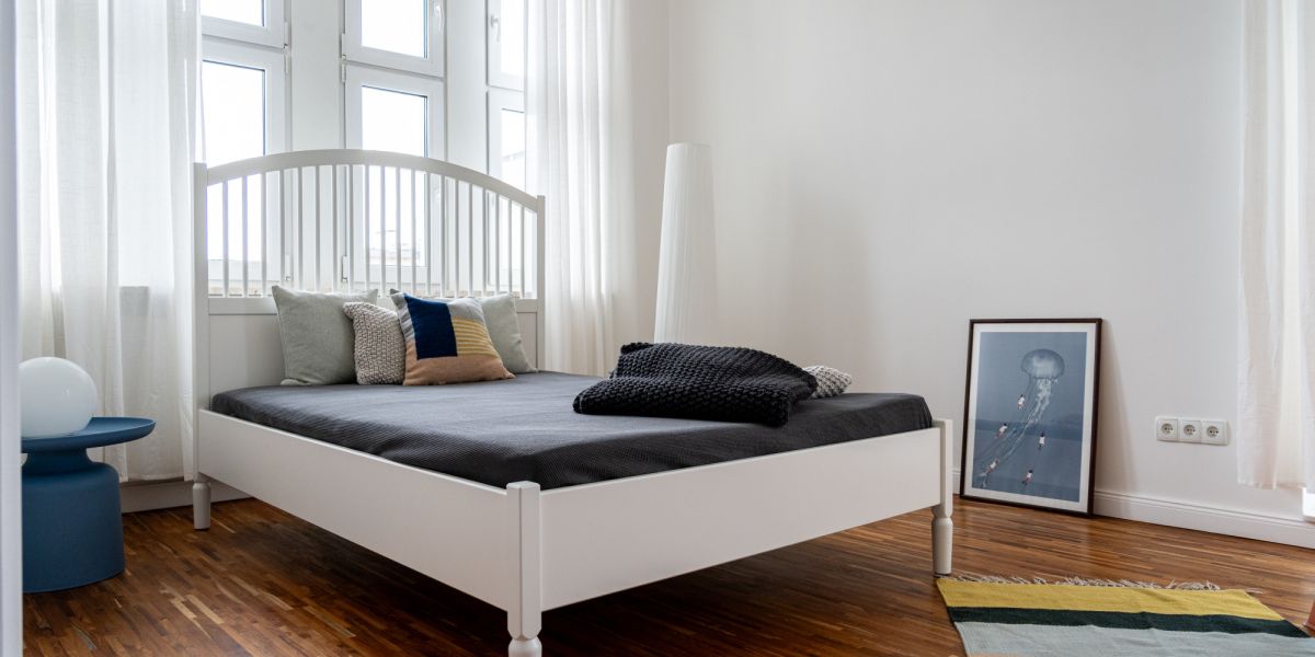 Wygodne łóżko z nowym materacem, komplet poduszek i pledów, stylowe dodatki, lekkie, białe zasłony, minimalistyczna sztuka na ścianie, wyjście na balkon z widokiem na zieleń. Pokój zapewnia pełną prywatność i ciszę. W sypialni duże szafy na ubrania od podłogi do sufitów.