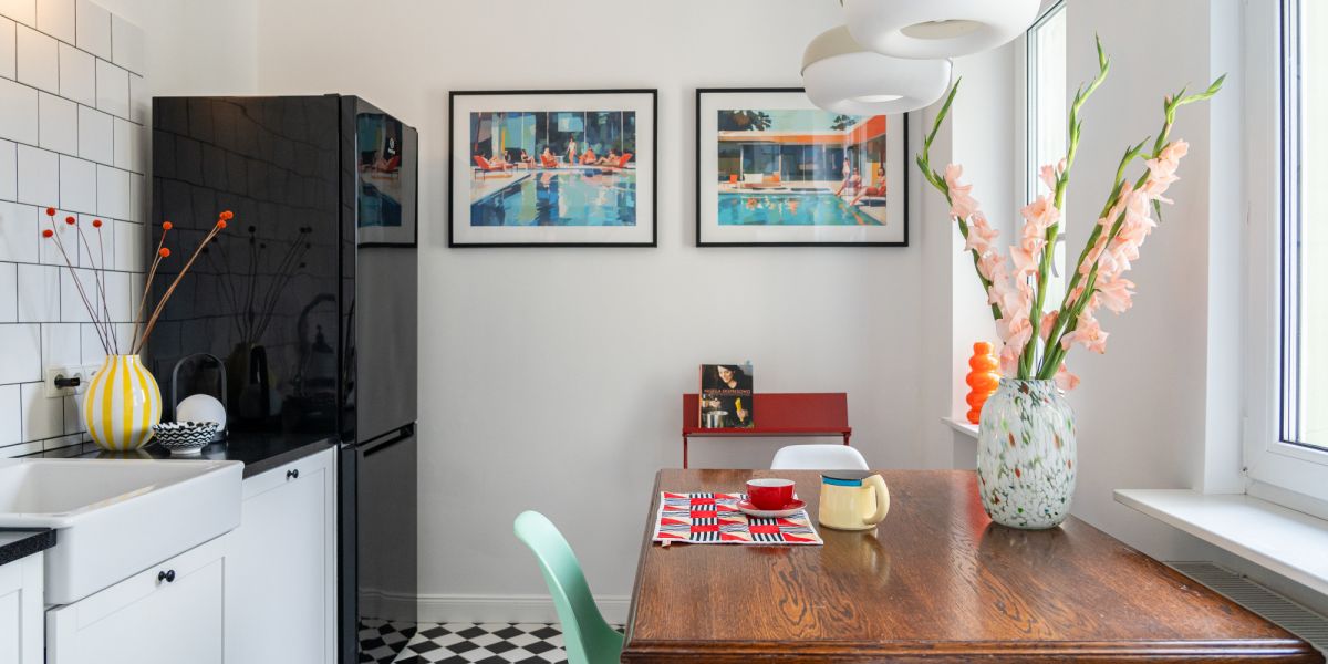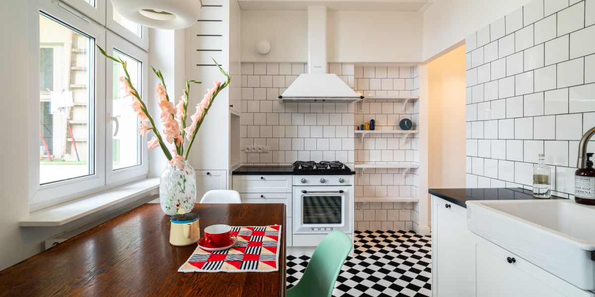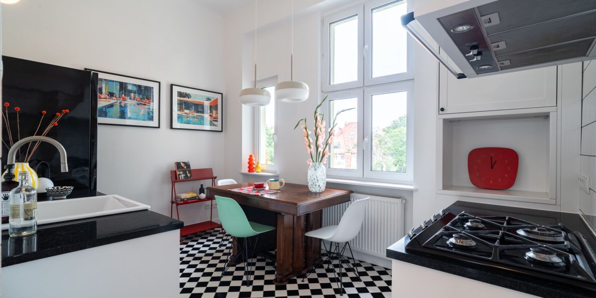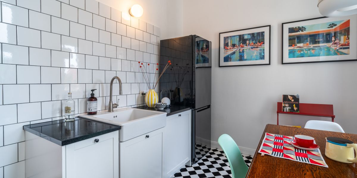 Funkcjonalna, jasna kuchnia z klasycznymi, białymi kaflami w stylu retro i czarno-białą podłogą. Wyposażona w piekarnik i okap SMEG, dużą lodówkę, zmywarkę, designerskie akcesoria i wyjątkową jadalnię z drewnianym stołem oraz krzesłami Vitra.